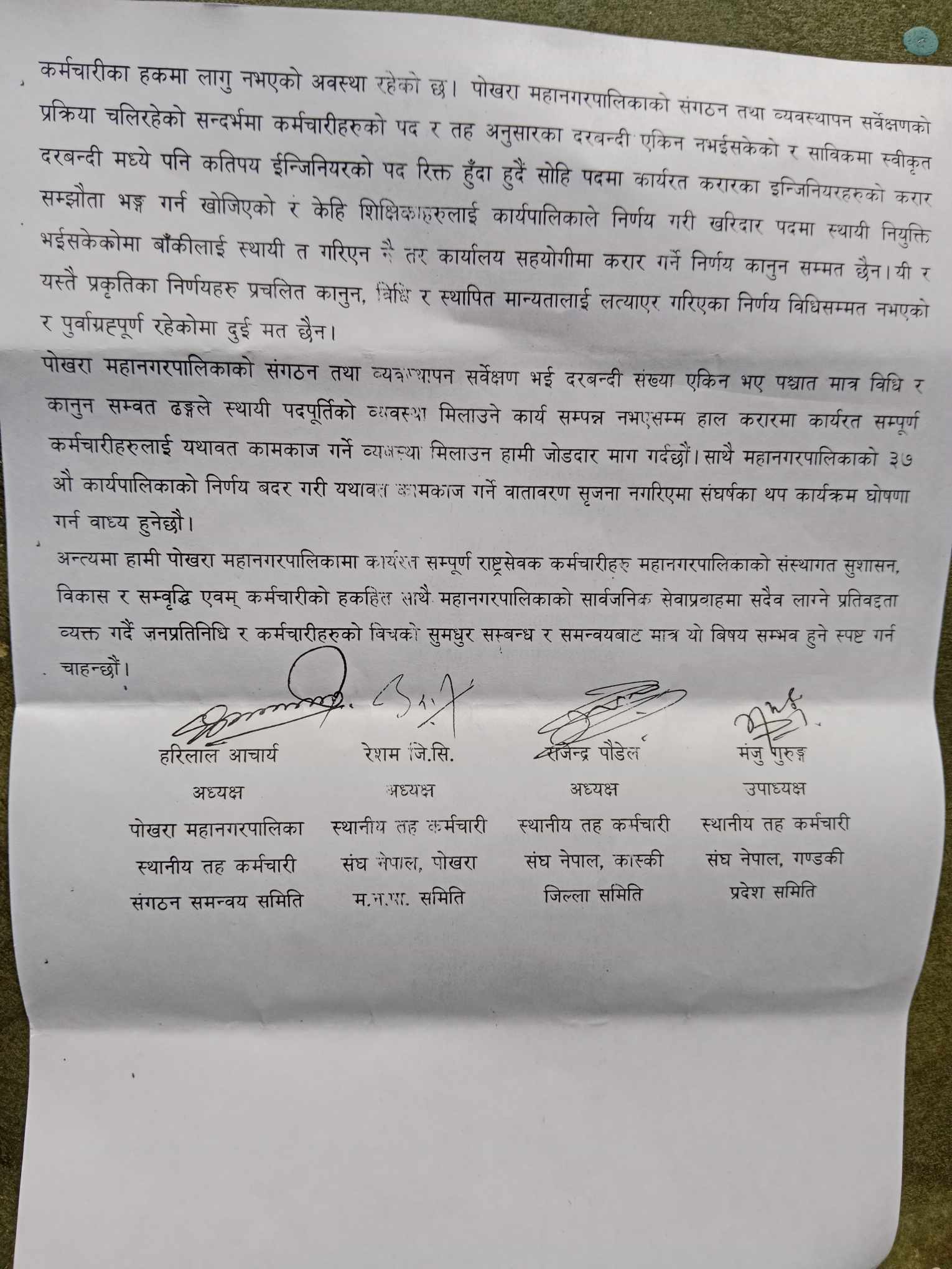 विज्ञप्तिमा पोखरा महानगरपालिका स्थानीय तह कर्मचारी संगठन समन्वय समितिका अध्यक्ष हरिलाल आचार्य, स्थानीय तह कर्मचारी संघ नेपाल पोखरा समितिका अध्यक्ष रेशम जिसी, स्थानीय तह कर्मचारी संघ कास्की अध्यक्ष राजेन्द्र पौडेल र गण्डकीका उपाध्यक्ष मञ्जु गुरुङले हस्ताक्षर गरेका छन् ।