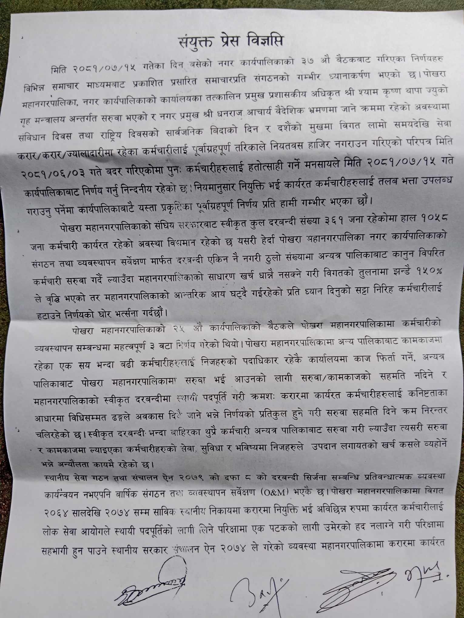 पोखरा महानगरपालिका स्थानीय तह कर्मचारी संगठन समन्वय समिति, स्थानीय तह कर्मचारी संघ पोखरा महानगर समिति, स्थानीय तह कर्मचारी संघ कास्की र स्थानीय तह कर्मचारी संघ गण्डकी प्रदेश समितिले संयुक्त विज्ञप्ति निकालेर हिजोको निर्णय फिर्ता लिई कर्मचारीलाई निर्वाध रुपमा काम गर्ने वातावरण मिलाउन माग गरेका छन् ।