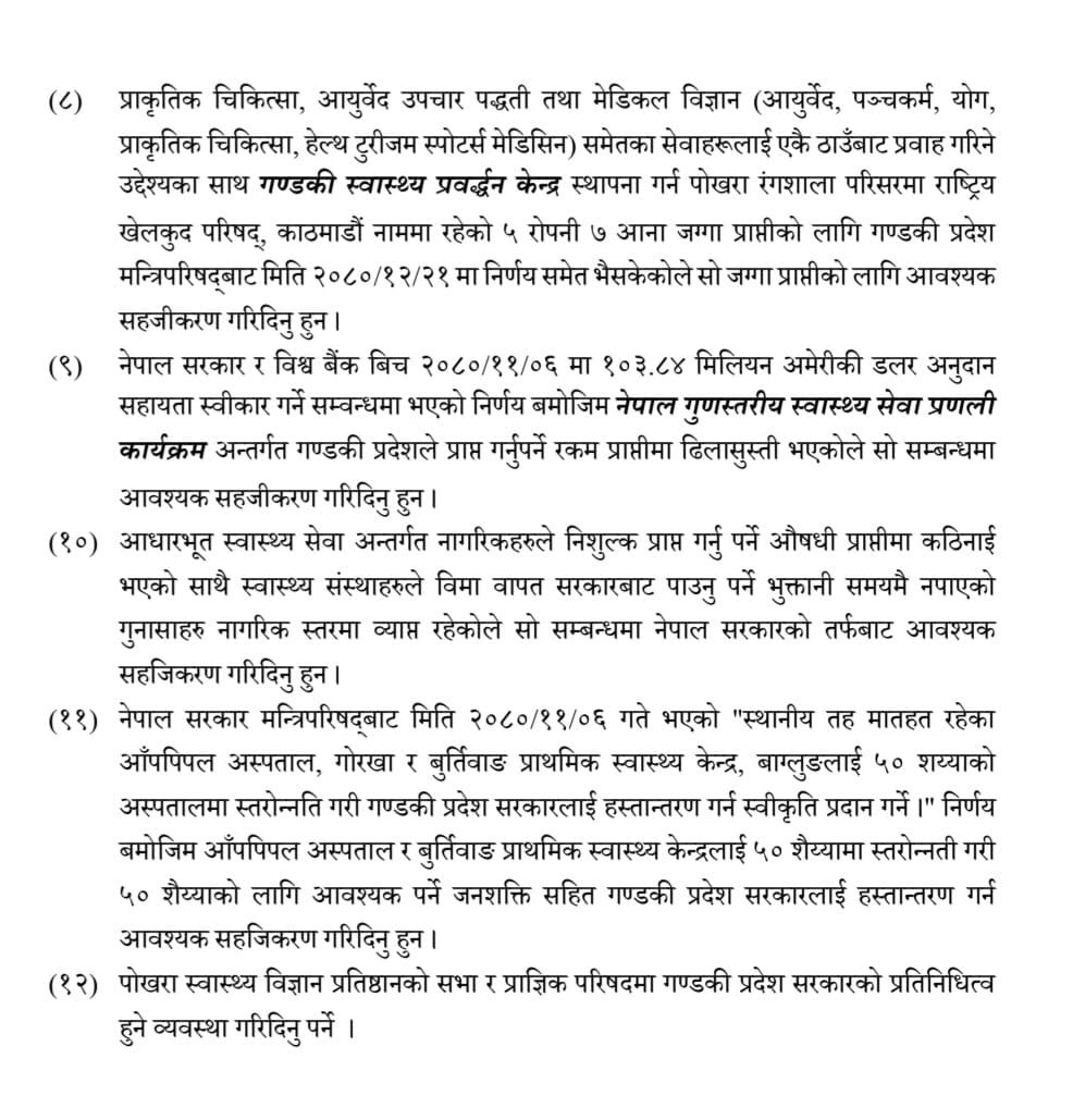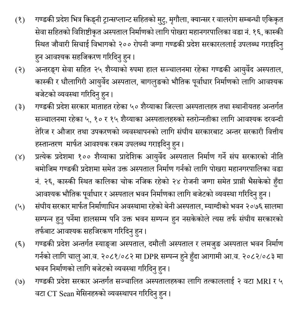 तत्काल गण्डकी प्रदेशको स्वास्थ्य क्षेत्रमा गर्नेपर्ने महत्वपुर्ण काम प्रदेश सरकार र स्वास्थ्य मन्त्रालय संग बजेटको अभाव भएका कारण प्रदेश सरकारले मात्र गर्न नसक्ने बिषयहरु बुँदागत रुपमा प्रधानमन्त्रीज्यु संग प्रस्तुत गरिएको स्वास्थ्यमन्त्री पाठकले जानकारी दिए ।