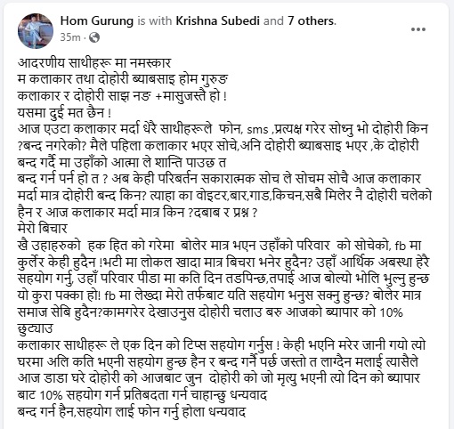 कृष्णको स्टाटसपछि डाँडाघरे दोहोरी साँझका सञ्चालक होम गुरुङले कृष्णसहित केहीलाई ट्याग गर्दै स्टाटस लेखेका छन्ः ‘… आज एउटा कलाकार मर्दा धेरै साथीहरूले फोन, एसएमएस, प्रत्यक्ष गरेर सोध्नुभो दोहोरी किन बन्द नगरेको ? मैले पहिला कलाकार भएर सोचेँ, अनि दोहोरी व्यवसायी भएर । के दोहोरी बन्द गर्दैमा उहाँको आत्माले शान्ति पाउछ त ? बन्द गर्न पर्न हो त ? अब केही परिवर्तन सकारात्मक सोच ले सोचम् । आज कलाकार मर्दा मात्र दोहोरी बन्द किन ? त्यहाँका वेटर, बार, गाड, किचन सबै मिलेर नै दोहोरी चलेको हैन र ? आज कलाकार मर्दा मात्र किन दबाब र प्रश्न ?’