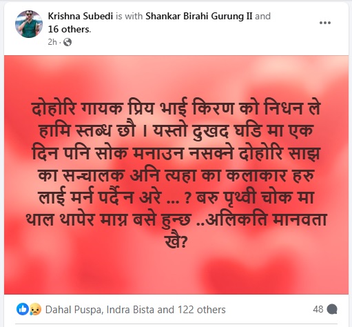 लोकदोहोरी गायक कृष्ण सुवेदीले फेसबुकमा स्टाटस नै लेखेर खुलेर बिरोध गरेका छन् । उनले भनेका छन्ः ‘ दोहोरी गायक प्रिय भाइ किरणको निधनले हामी स्तब्ध छौँ । यस्तो दुःखद घडीमा एक दिन पनि शोक मनाउन नसक्ने दोहोरि साँझका सञ्चालक र त्यहाँका कलाकारहरूलाई मर्न पर्दैन अरे ?’