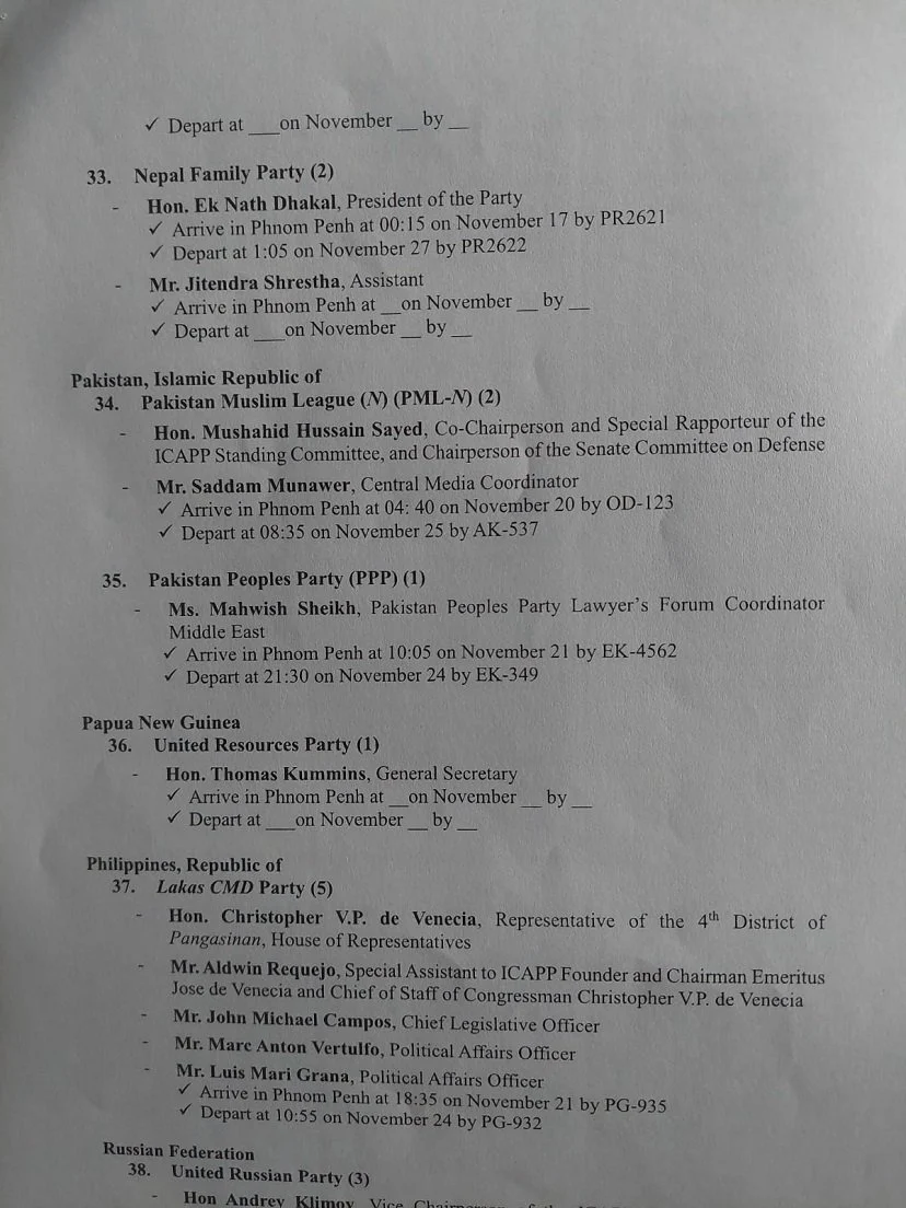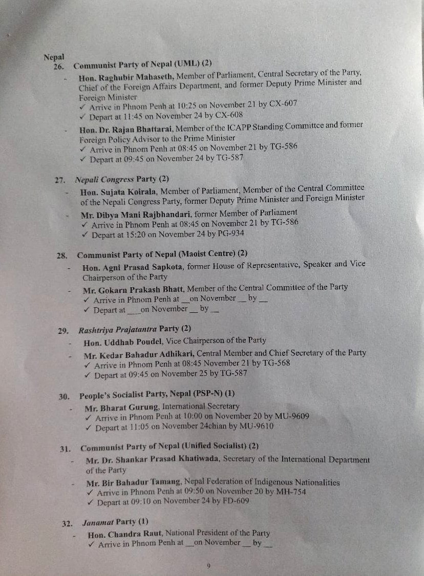 कम्बोडियन पिपल्स पार्टी (सीपीपी)को आयोजना हुन गइरहेको साधारण सभामा सहभागी हुन नेताहरू कम्बोडियाको राजधानी नोमपेन्ह आइपुग्ने क्रम जारी रहेको नेकपा एकीकृत समाजवादीका विदेश विभाग सचिव डा.शङ्कर खतिवडाले जानकारी दिए । खतिवडाका अनुसार एसियाभन्दा बाहेक १५ वटा मुलुकबाट १६ वटा राजनीतिक दलका ४० जना नेताहरू र ३९ जना पर्यवेक्षकहरू सहभागी हुनेछन् ।