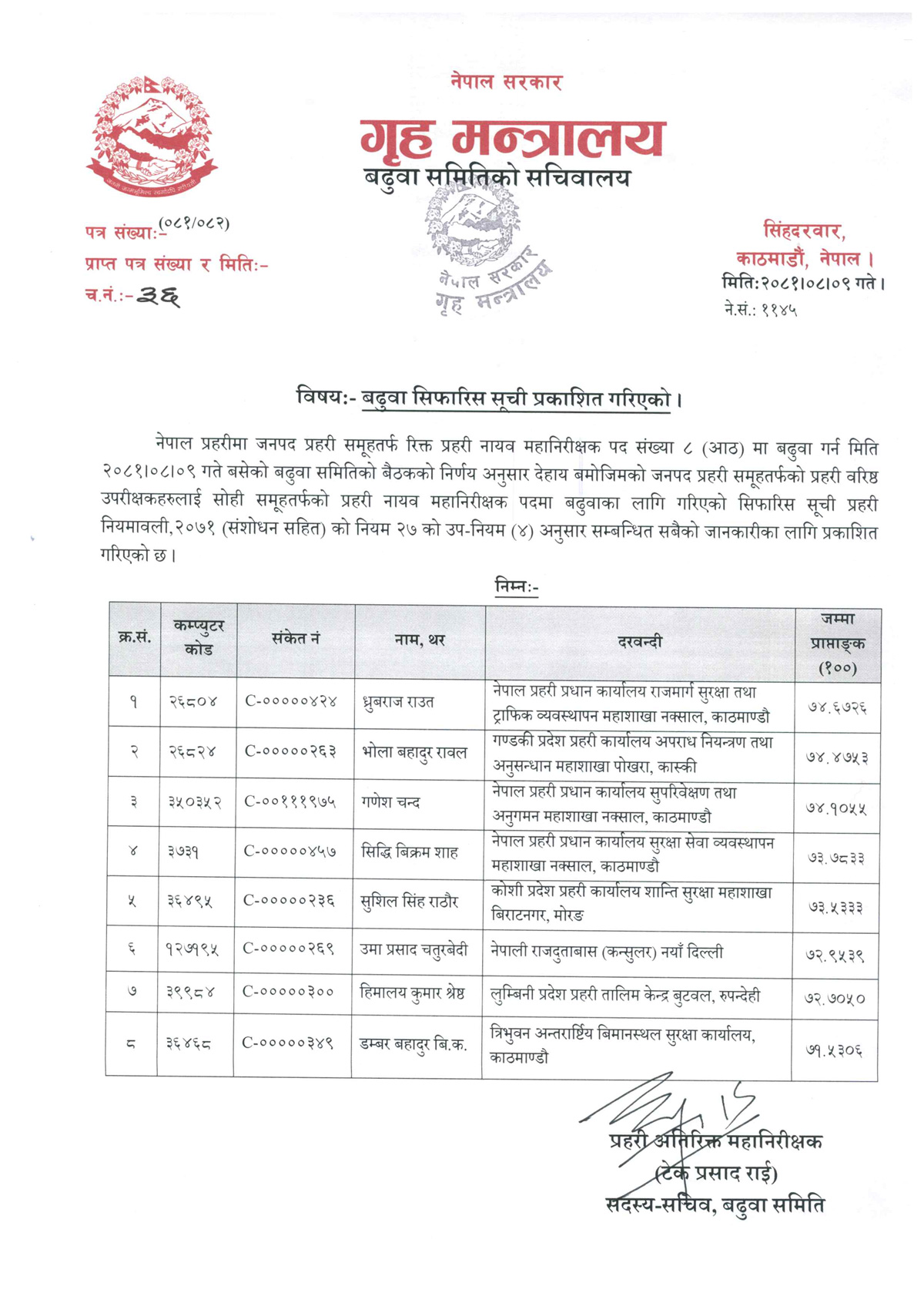 सूचनामा भनिएको छ, ‘नेपाल प्रहरीमा जनपद प्रहरी समूहतर्फ रिक्त प्रहरी नायव महानिरीक्षक पद संख्या ८ (आठ) मा बढुवा गर्न २०८१।०८।०९ गते बसेको बढुवा समितिको बैठकको निर्णय अनुसार देहाय बमोजिमको जनपद प्रहरी समूहतर्फको प्रहरी वरिष्ठ उपरीक्षकहरुलाई सोही समूहतर्फको प्रहरी नायव महानिरीक्षक पदमा बढुवाका लागि गरिएको सिफारिस सूची नियमावली,२०७१ (संशोधन सहित) को नियम २७ को उप-नियम (४) अनुसार सम्बन्धित सबैको जानकारीका लागि प्रकाशित गरिएको छ।’