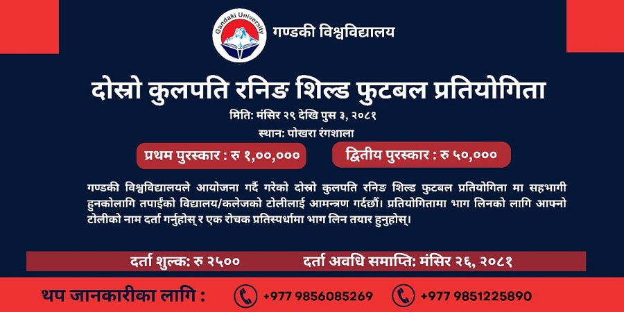 पोखरा । गण्डकी विश्वविद्यालयको आयोजनामा दोस्रो कुलपति रनिङ सिल्ड फुटबल प्रतियोगिता हुने भएको छ । मंसिर २९ गतेदेखि पुस ३ गतेसम्म पोखरा रंगशालामा दोस्रो कुलपति रनिङ सिल्ड फुटबल प्रतियोगिता हुन लागेको हो ।