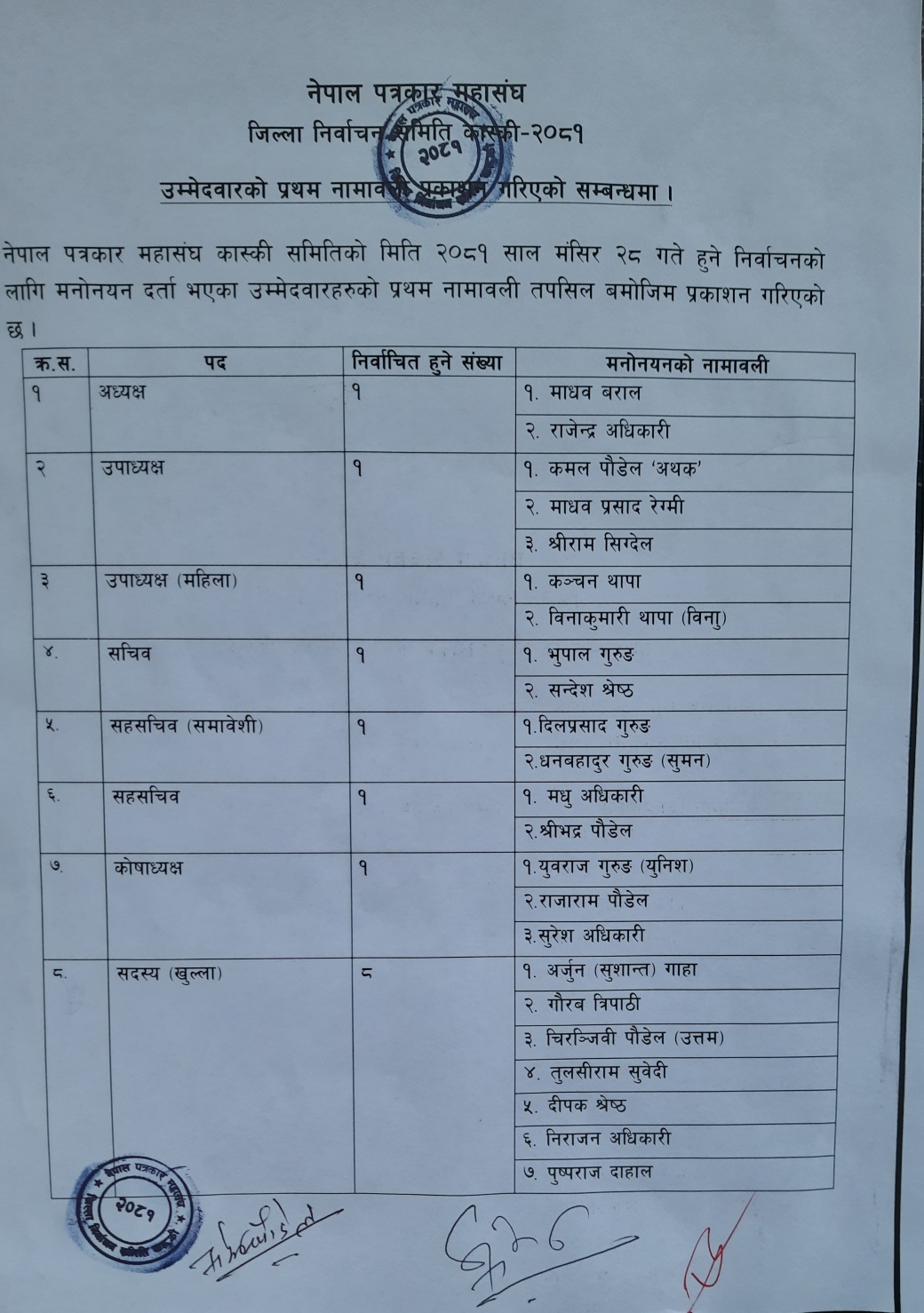 पत्रकार महासंघ कास्कीको नयाँ नेतृत्वका लागि निम्न उम्मेद्वार मैदानमा छन् ।