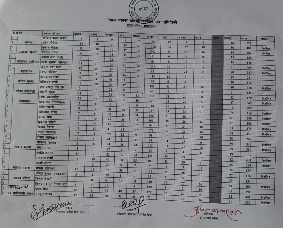 उपाध्यक्षमा प्रकाश पौडेल, उपाध्यक्ष (महिला) मायाकुमारी अधिकारी, महासचिव जमुना वर्षा शर्मा, सचिव भविश्वर पाण्डे, सचिव (समावेशी) रोशनी गुरुङ र कोषाध्यक्ष रमेश बस्ताकोटी निर्वाचित भए । अध्यक्ष पौडेल, महासचिव शर्मा र सचिव गुरूङ कास्कीका पत्रकार हुन् ।