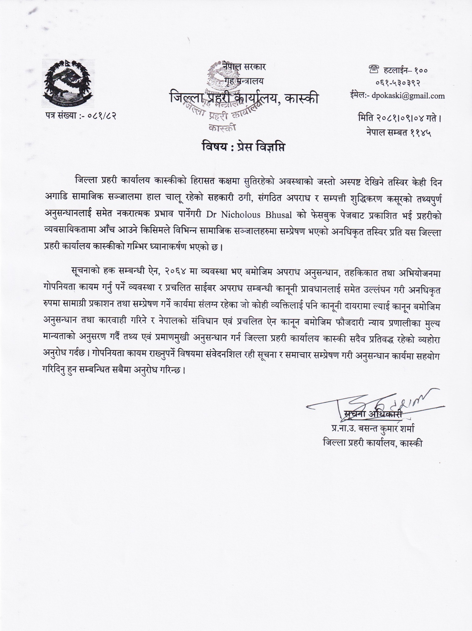 कार्यालयका प्रवक्ता डीएसपी वसन्तकुमार शर्माले बिहीबार प्रेस विज्ञप्ति सार्वजनिक गर्दै अनुसन्धानलाई समेत नकारात्मक प्रभाव पार्ने गरी फोटो सार्वजनिक गरिएको भनिएको छ ।