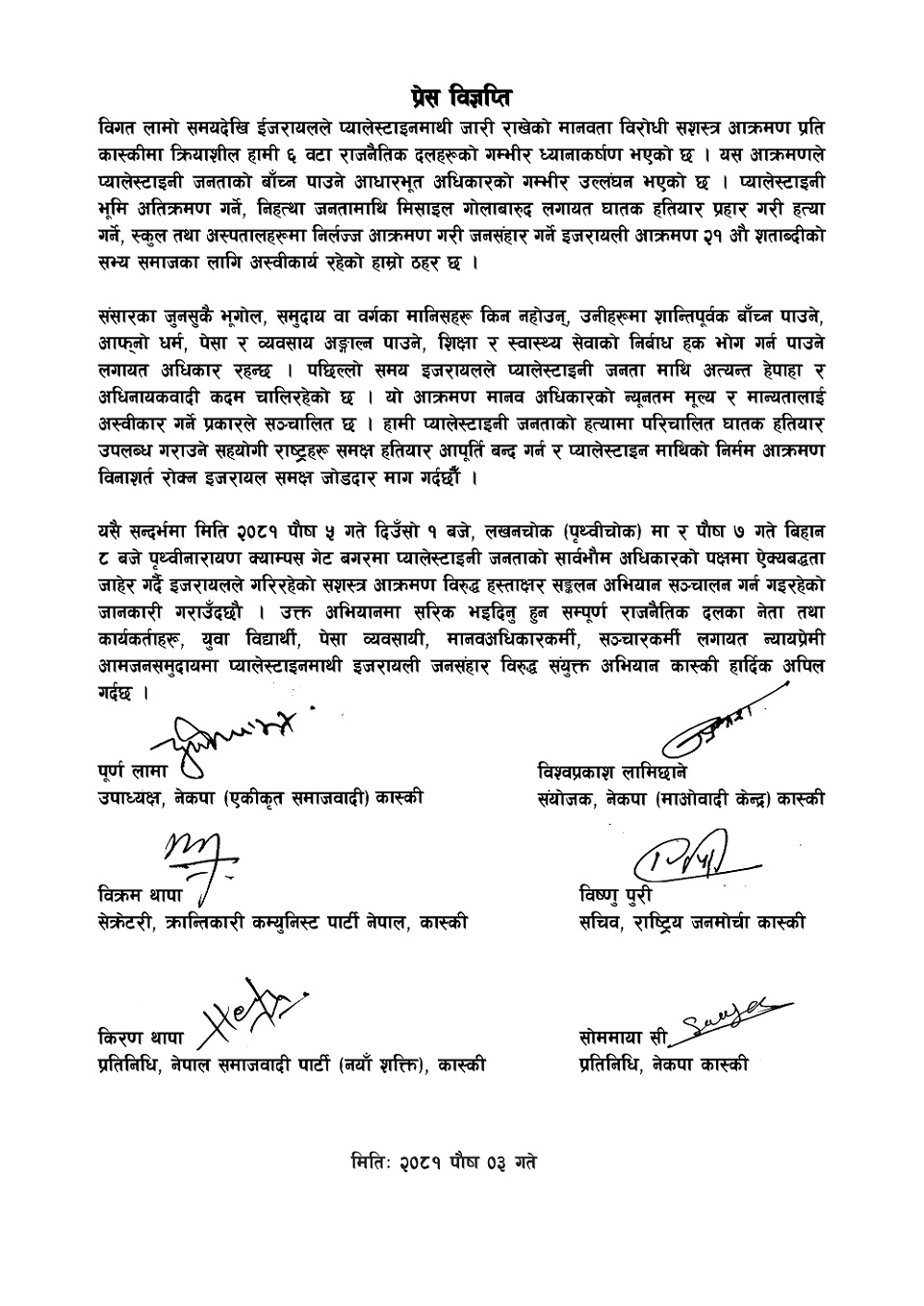 भोलि पौष ५ गते दिउँसो १ बजे, पृथ्वीचोकमा र पौष ७ गते बिहान ८ बजे पृथ्वीनारायण क्याम्पस गेट बगरमा प्यालेस्टाइनी जनताको सार्वभौम अधिकारको पक्षमा ऐक्यबद्धता जाहेर गर्दै इजरायलले गरिरहेको सशस्त्र आक्रमण विरुद्ध हस्ताक्षर सङ्कलन अभियान सञ्चालन गर्न गइरहेको उनीहरुले जानकारी गराएका छन् ।