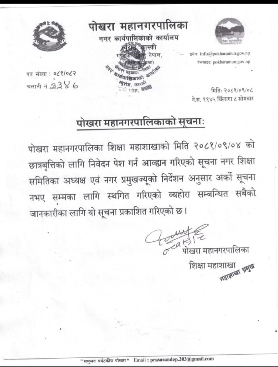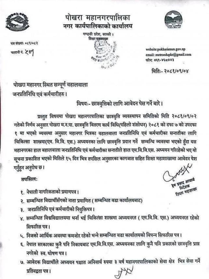 पोखरा महानगरपालिकाले जनप्रतिनिधि र कर्मचारीका एमबिबिएस पढ्ने छोराछोरीलाई छात्रवृत्ति उपलब्ध गराउने विवादास्पद निर्णय तत्कालका लागि स्थगित गरेको छ ।