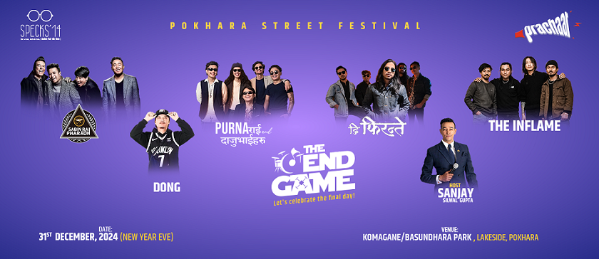 ‘द इण्ड गेम’ नाम दिएर अंग्रेजी नयाँ वर्ष २०२५ लाई स्वागत गर्न लेकसाइडको बसुन्धरा पार्क/कोमागाने पार्कमा डिसेम्बर ३१ (पुस १६) मा कार्यक्रम हुन लागेको हो । प्रचार नेपाल र स्पेक्स–१४ को आयोजना र आर्बिटरी इभेन्टससँगको सहकार्यमा कार्यक्रम हुने भएको हो ।