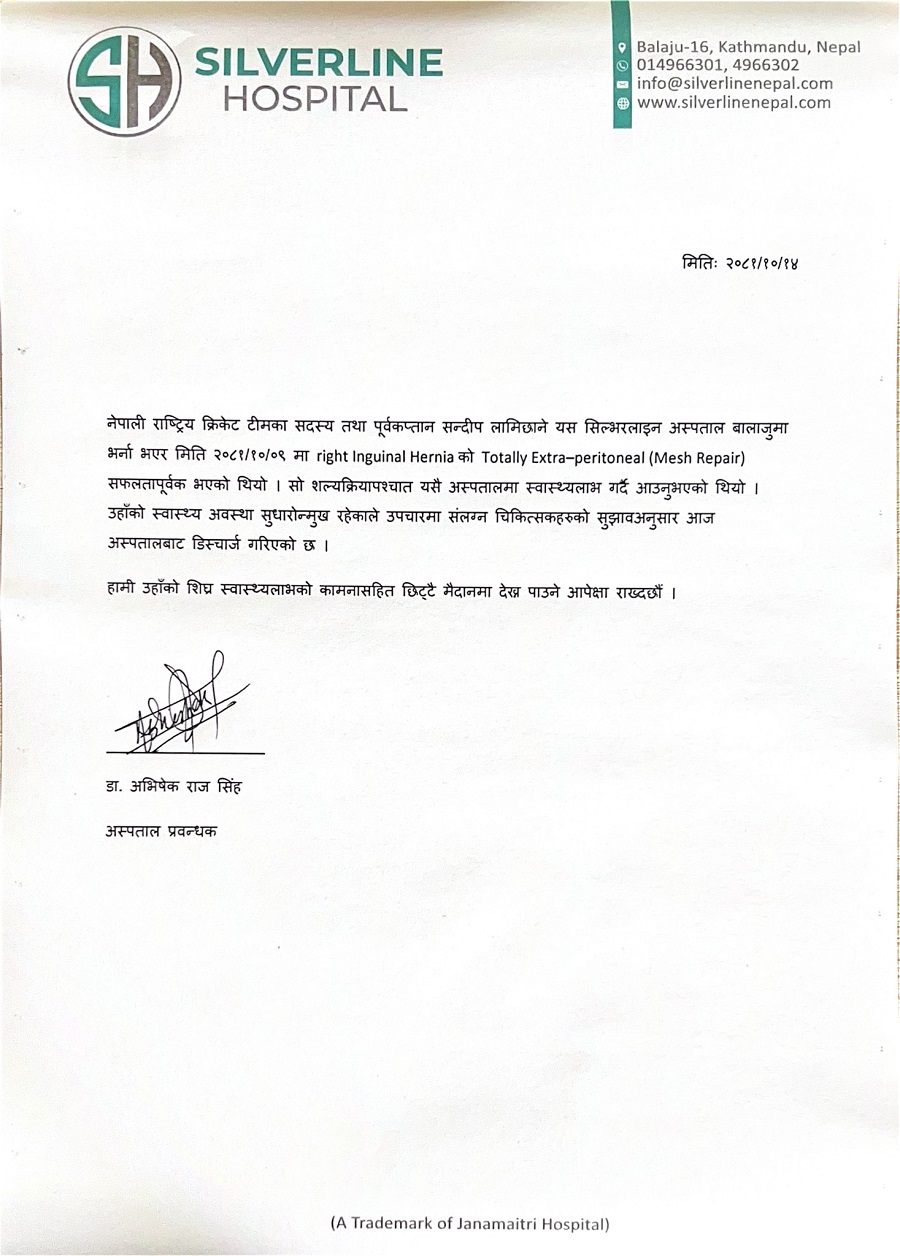 क्रिकेटर लामिछानेको बालाजुस्थित सिल्भरलाइन अस्पतालमा गत बुधबार शल्यक्रिया भएको थियो ।