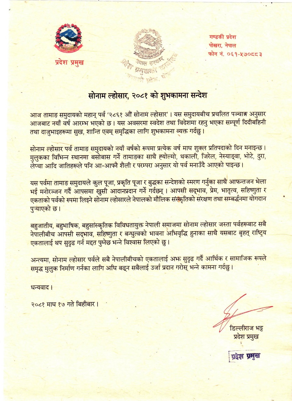 पोखरा । तामाङ समुदायको महान् पर्व ‘२८६१ औं सोनाम ल्होसार’ को अवसरमा गण्डकी प्रदेशका प्रमुख डिल्लीराज भट्टले शुभकामना सन्देश जारी गरेका छन् ।