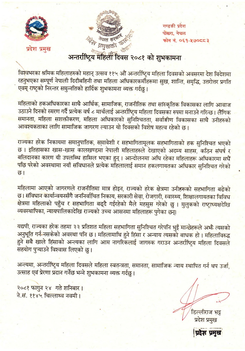 ११५ औं अन्तर्राष्ट्रिय महिला दिवसको अवसरमा शनिबार शुभकामना सन्देश जारी गर्दै उहाँले यो दिवस महिलाको हकअधिकारका साथै आर्थिक, सामाजिक, राजनीतिक तथा सांस्कृतिक विकासका लागि आवाज उठाउने दिनको स्मरण गर्दै प्रत्येक वर्ष ८ मार्चमा विश्वभर मनाउने गरिएको उल्लेख गरेका छन् ।