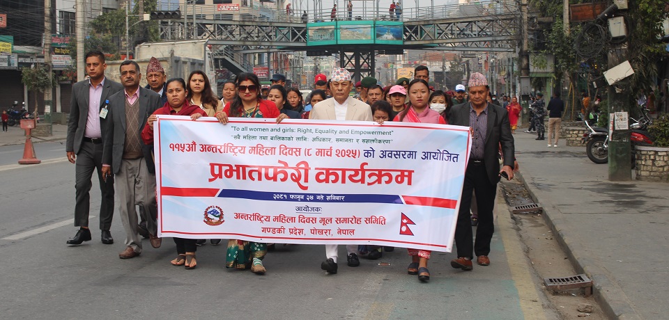 पोखरा । ११५ औँ अन्तर्राष्ट्रिय महिला दिवसको अवसरमा अन्तर्राष्ट्रिय महिला दिवस मूल समारोह समिति गण्डकी प्रदेश पोखराको आयोजनामा प्रभातफेरी कार्यक्रम सम्पन्न भएको छ ।