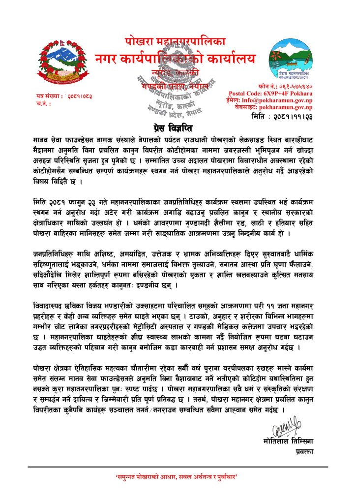 महानगरले धार्मिक सहिष्णुतालाई भड्काउने, समाजलाई विभाजित गर्ने र शान्ति खलबल्याउने नियतले गरिएको यो कार्य कानुनी रूपमा दण्डनीय रहेको स्पष्ट पारेको छ। मानव सेवा फाउन्डेसनले वैशाखबाट कोटीहोम गर्ने बताउँदै आए पनि यथास्थितिमा त्यो हुन नसक्ने पोखरा महानगरपालिकाले स्पष्ट पारेको छ।