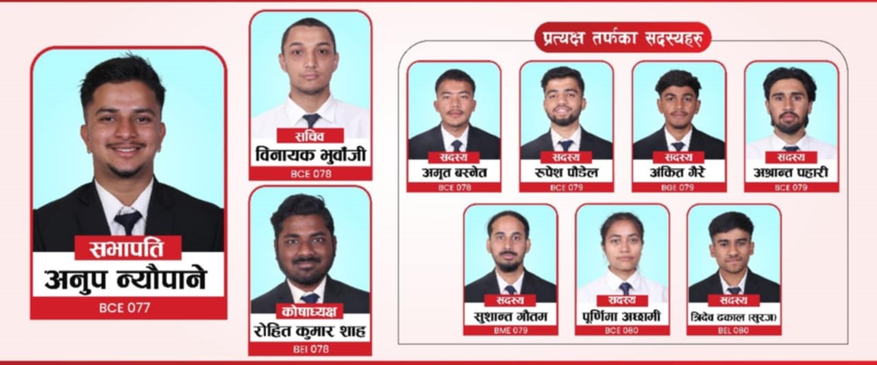 प्रत्यक्षतर्फ निर्वाचन हुने सचिवमा विनायक भुवाँजी, कोषाध्यक्षमा रोहितकुमार शाहलाई उम्मेद्वार बनाएको छ । प्रत्यक्ष सदस्यमा अमृत बस्नेत, रुपेश पौडेल, अंकित गैरे, अश्रान्त पहारी, सुशान्त गौतम, पूर्णिमा अछामी, त्रिदेव ढकाल(सुरज)उम्मेद्वार रहेका छन् ।