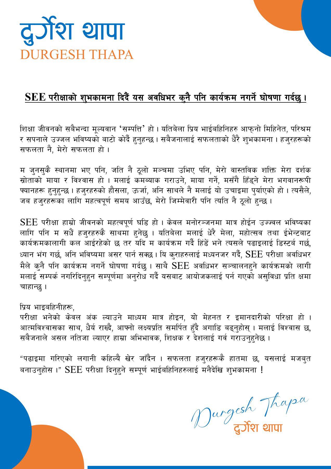 सामाजिक सञ्जालबाट बुधबार विज्ञप्ति जारी गर्दै उनले भाइबहिनीहरूको पढाइमा असर पर्ने सक्ने भन्दै एसइई परीक्षा अवधिभर सांगीतिक कार्यक्रम नगर्ने घोषणा गरेका हुन् ।