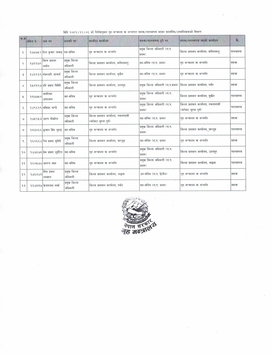 गण्डकीका बागलुङ, पर्वत र नवलपुरका सिडिओ फेरिए, १३ सहसचिवको सरूवा