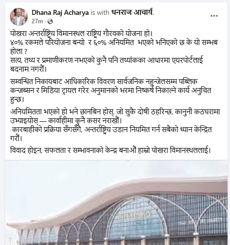 उनले थपेका छन् – ‘अनियमितता भएको हो भने छानबिन होस्, जो सुकै दोषी ठहरिन्छ, कानुनी कठघरामा उभ्याइयोस् — कार्वाहीमा कुनै कसर नराखौं। कारबाहीको प्रक्रिया सँगसँगै, अन्तर्राष्ट्रिय उडान नियमित गर्न सबैको ध्यान केन्द्रित गरौं । विवाद होइन, सफलता र सम्भावनाको केन्द्र बनाऔं हाम्रो पोखरा विमानस्थललाई ।’