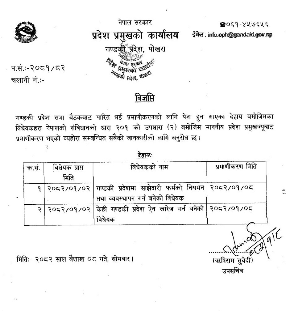 प्रदेश प्रमुखको कार्यालयका उपसचिव ऋषिराम सुवेदीका अनुसार ‘गण्डकी प्रदेशमा साझेदारी फर्मको नियमन तथा व्यवस्थापन गर्न बनेको विधेयक’ र ‘केही गण्डकी प्रदेश ऐन खारेज गर्न बनेको विधेयक’ प्रमाणीकरण भएका हुन् ।