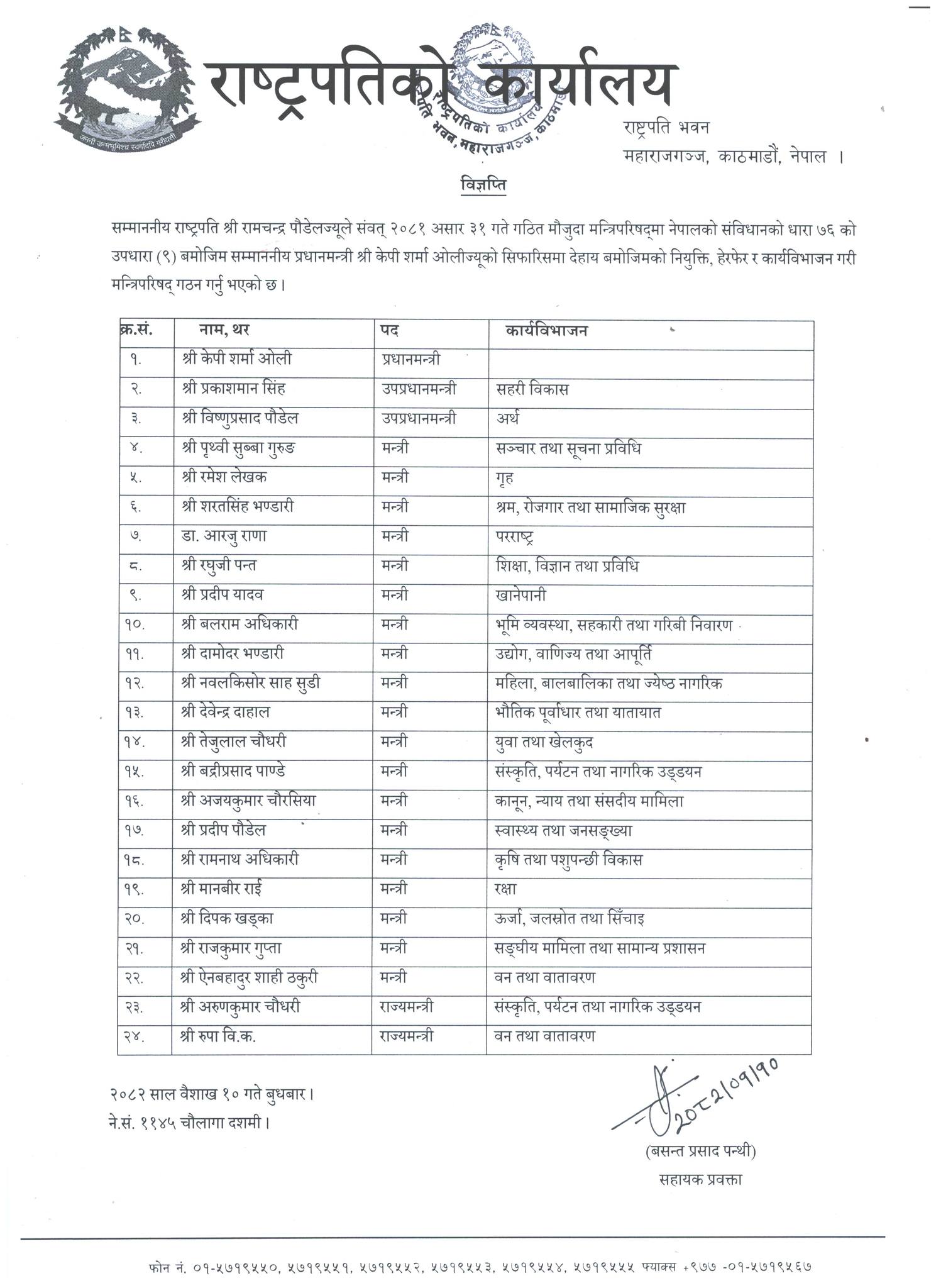 वरियता अनुसार प्रधानमन्त्री केपी शर्मा ओलीपछि दोस्रो नम्बरमा उपप्रधान एवम सहरी विकासमँन्त्री प्रकाशनमान सिंह, तेस्रो नम्बरमा उपप्रधान एवम अर्थमन्त्री विष्णुप्रसाद पौडेल, चौथो नम्बरमा सञ्चार तथा सूचना प्रविधिमन्त्री पृथ्वीसुब्बा गुरुङ, पाचौँ नम्बरमा गृहमन्त्री रमेश लेखक, छैटौ नम्बरमा श्रम, रोजगार तथा सामाजिक सरक्षामन्त्री शरदसिंह भण्डारी र सातौ नम्बरमा परराष्ट्रमन्त्री डा.आरजु राणा रहेका छन् ।