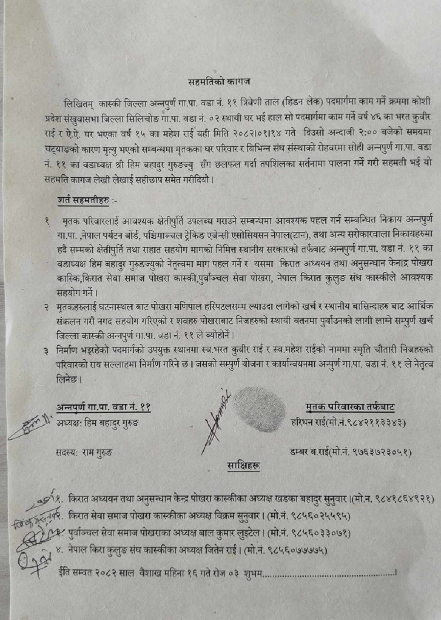 साथै, शवहरु मृतकका स्थायी वतनमा पुर्याउन लाग्ने सम्पूर्ण खर्च अन्नपूर्ण गाउँपालिका– ११ ले व्यहोर्ने र निर्माण भइरहेको पदमार्गको उपयुक्त स्थानमा मृतकहरुको नाममा स्मृति चौतारी निर्माण गरिने सहमति भएको छ ।