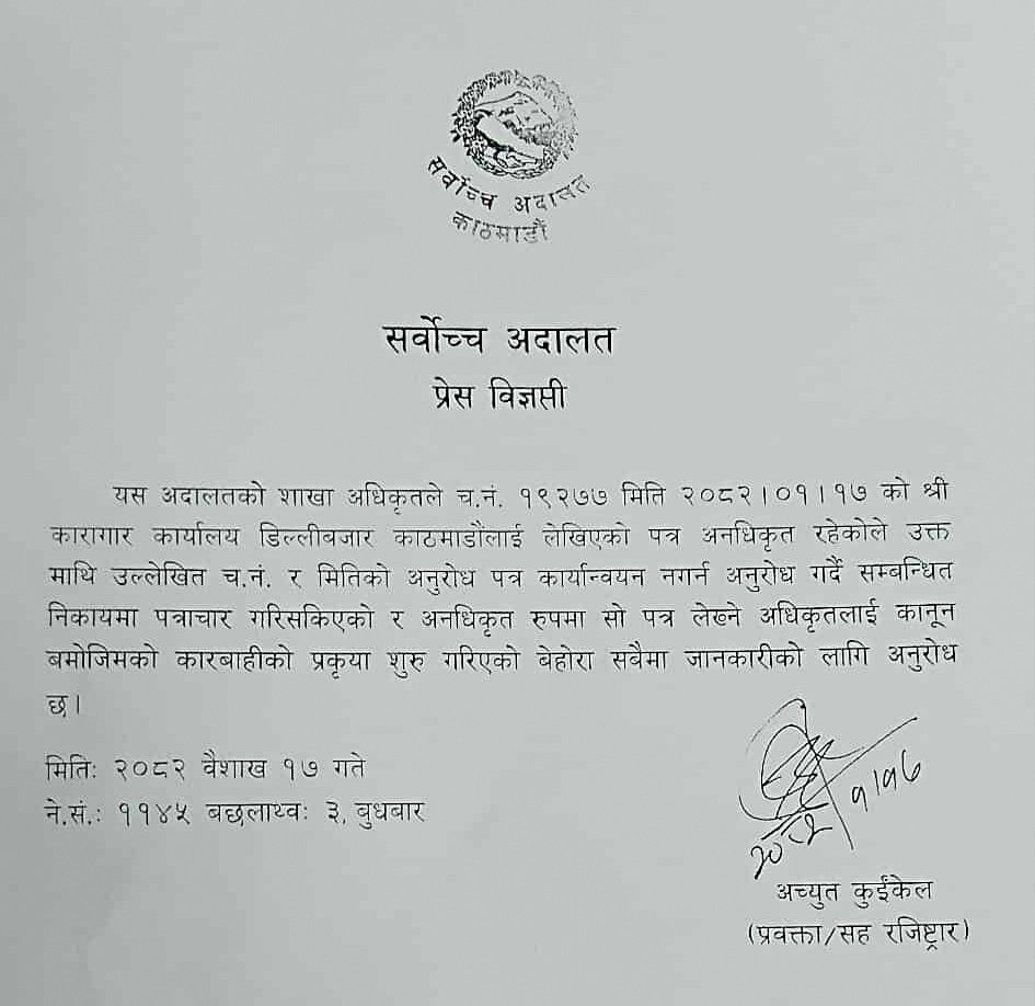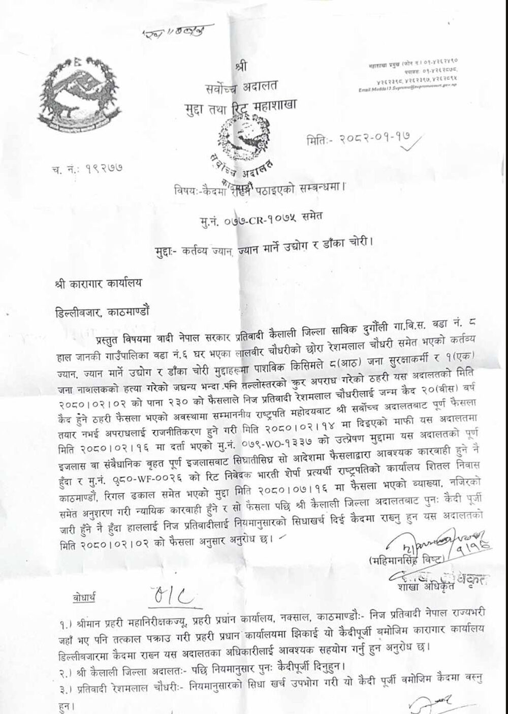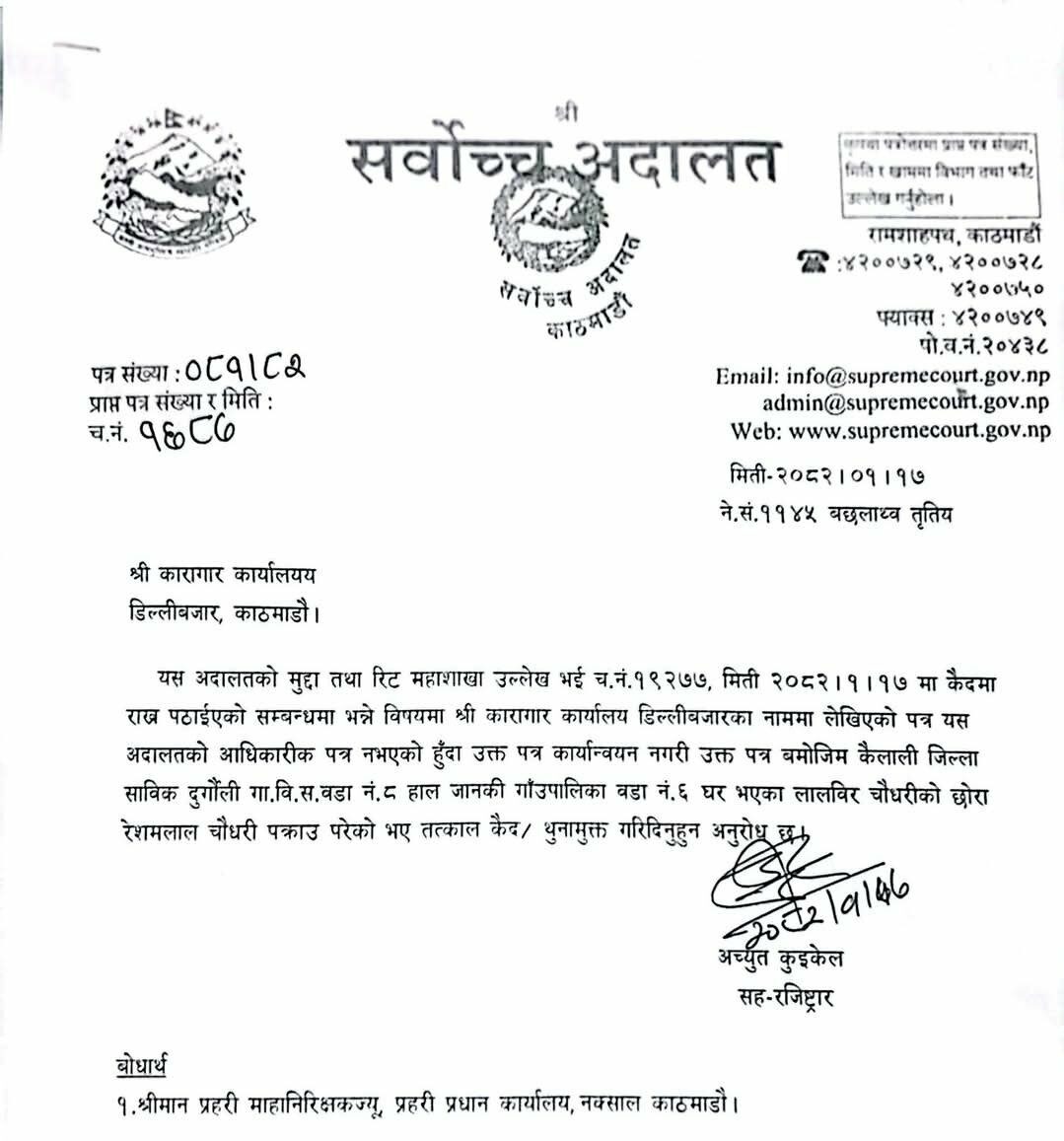अनधिकृत पत्र कार्यान्वयन नगरी चौधरीलाई तत्काल थुनामुक्त गर्न कारागारलाई भनिएको छ । पत्रमा भनिएको छ, ‘यस अदालतको मुद्दा तथा रिट महाशाखा उल्लेख भई च.नं. १९२७७, मिति २०८२ । १ । १७ मा कैदमा राख्न पठाईएको सम्बन्धमा भन्ने विषयमा श्री कारागार कार्यालय डिल्लीबजारका नाममा लेखिएको पत्र यस अदालतको आधिकारीक पत्र नभएको हुँदा उक्त पत्र कार्यान्वयन नगरी उक्त पत्र बमोजिम कैलाली जिल्ला साविक दुर्गौली गा.वि.स.वडा नं. ८ हाल जानकी गाउँपालिका वडा नं.६ घर भएका लालवीर चौधरीको छोरा रेशमलाल चौधरी पक्राउ परेको भए तत्काल कैद / थुनामुक्त गरिदिनुहुन अनुरोध छ ।’
