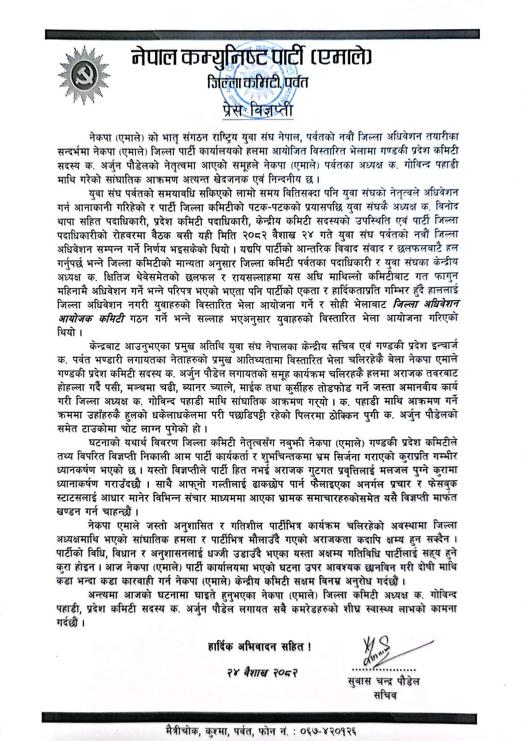 एमाले गण्डकीको विज्ञप्तिप्रति पर्वत जिल्ला कमिटीको आपत्ति