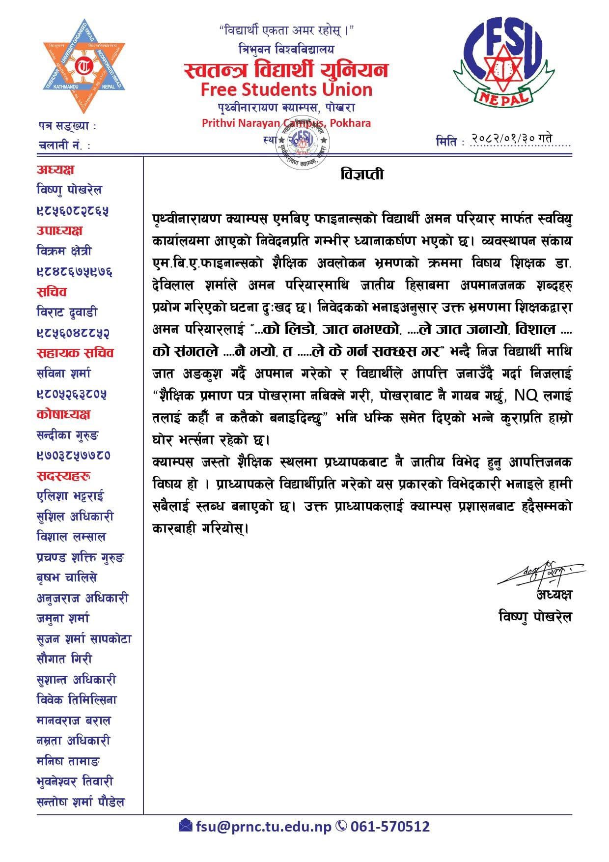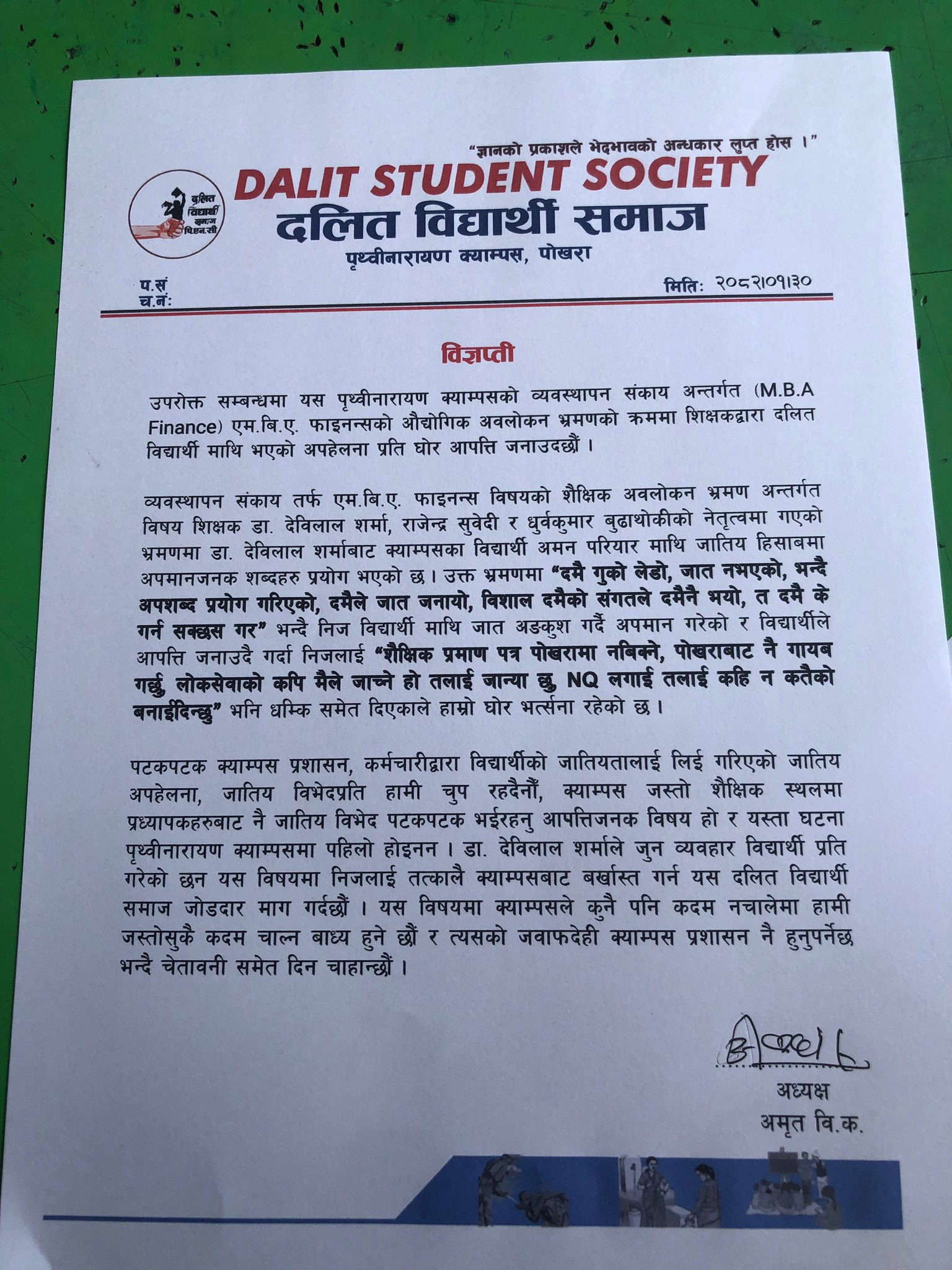पृथ्वीनारायण क्याम्पस, पोखराका उपप्राध्यापक डा. देवीलाल शर्मा एक जना विद्यार्थीमाथि जातीय विभेद गरेपछि कारबाहीमा परेका छन् ।