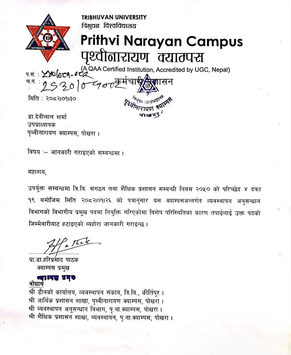 क्याम्पस प्रमुख पाठकले शर्मालाई व्यवस्थापन अनुसन्धान विभाग प्रमुखको जिम्मेवारीबाट विशेष परिस्थितिका कारण हटाइएको पत्र थमाएका हुन् । वैशाख २६ मा विभाग प्रमुख बनेका डा. शर्माको जिम्मेवारी ५ दिनमै खोसिएको हो ।