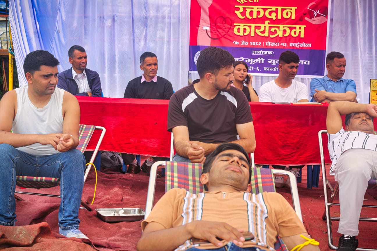 पोखरा । कास्कीको मादी–६ स्थित जुरेभूमि युवा क्लबको आयोजनामा पोखरा–१३ स्थित काहुखोला (तल्लो बसपार्क) मा शनिबार भएको रक्तदान कार्यक्रममा ५६ जनाले रगत दान गरेका छन् ।