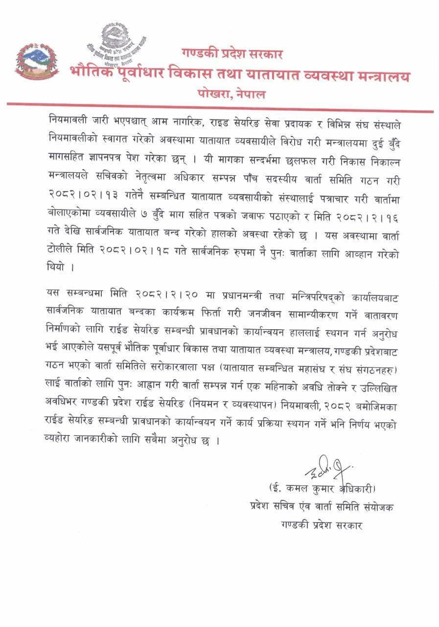 सरकार र यातायात व्यवसायीबीच सोमबार मध्यराति भएको सहमति कार्यान्वयन गराउन प्रधानमन्त्री तथा मन्त्रिपरिषद्को कार्यालयले मंगलबार गण्डकी प्रदेश सरकारलाई राइड सेयरिङ नियमावली स्थगित गर्न भन्दै पत्र पठाएको थियो ।