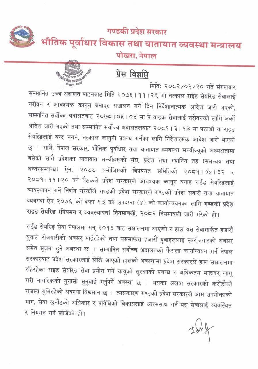 सरकार र यातायात व्यवसायीबीच सोमबार मध्यराति भएको सहमति कार्यान्वयन गराउन प्रधानमन्त्री तथा मन्त्रिपरिषद्को कार्यालयले मंगलबार गण्डकी प्रदेश सरकारलाई राइड सेयरिङ नियमावली स्थगित गर्न भन्दै पत्र पठाएको थियो ।