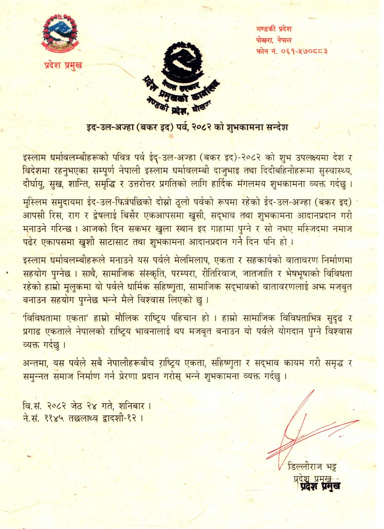 आज एक शुभकामना सन्देश जारी गर्दै प्रदेश प्रमुख भट्टले मुस्लिम समुदायमा ईद–उल–फित्रपछिको दोस्रो ठूलो पर्वको रूपमा बकर इद आपसी रिस, राग र द्वेषलाई बिर्सेर एकआपसमा खुसी, सद्भाव तथा शुभकामना आदानप्रदान गरी मनाउने पर्व भएको उल्लेख गरेका छन् ।