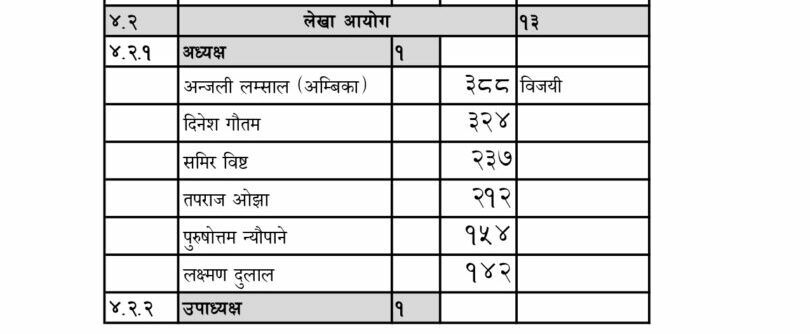 लेखा आयोग अध्यक्षमा अञ्जली लम्साल (अम्बिका) ले सहज जीत दर्ता गरेकी छन् । ६ जनाले अध्यक्षमा प्रतिष्पर्धा गरेकामा अञ्जलीले ३८८ मत ल्याएर विजयी भइन् । निकटतम् प्रतिष्पर्धी दिनेश गौतमभन्दा ६४ मत बढी ल्याएर अध्यक्ष जितेकी हुन् । दिनेशले ३२४ मत ल्याए ।