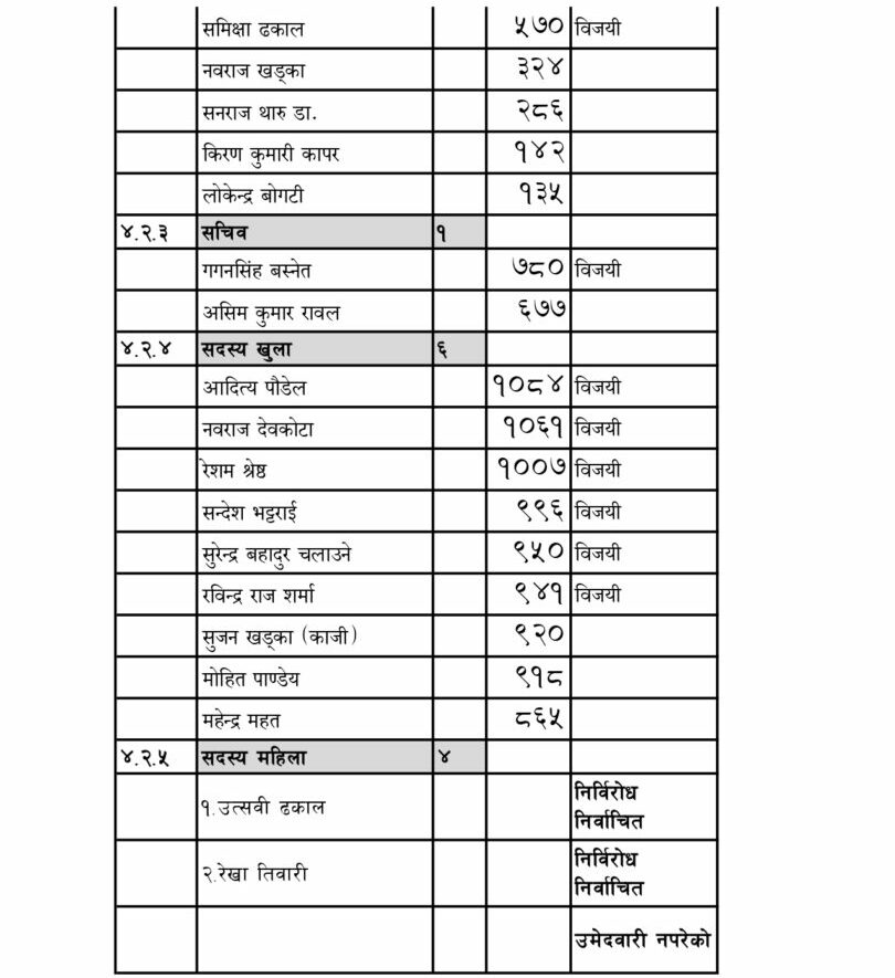 चारजना सचिवमा आकाश घर्ती मगर, रचना सापकोटा, समिम बाबु खान र गोपाल नेपाल विजयी भएका छन् ।