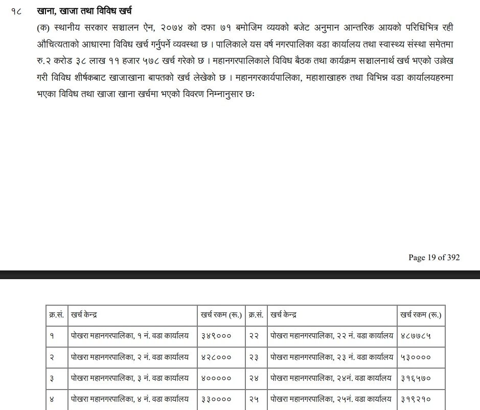 पोखरा महानगरपालिकाले आर्थिक वर्ष २०८०/८१ मा खाना, खाजा आदि नाममा झण्डै साढे २ करोड रुपैयाँ खर्च गरेको पाइएको छ ।