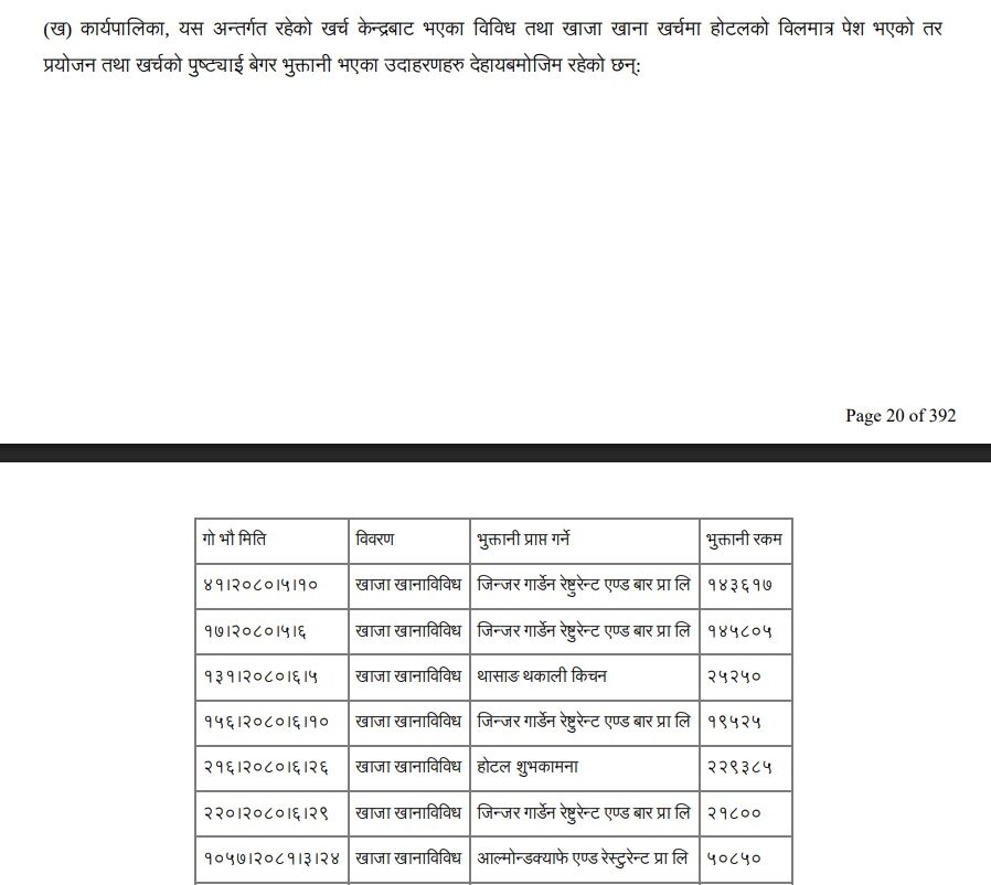 तर, महानगरपालिकाले कार्यक्रम संचालनार्थ खर्च भएको उल्लेख गरी खर्चको पुष्ट्याई बेगर केबल बिल भरपाई मात्र संलग्न गरी विविध शीर्षकबाट खाजाखाना बापतको खर्च गरेको उल्लेख गरेको छ ।