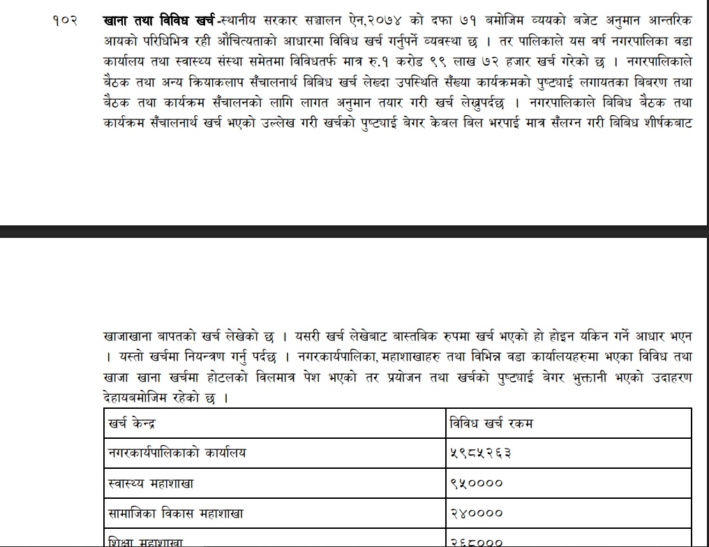 महानगरपालिका, महाशाखा तथा विभिन्न वडा कार्यालयमा भएका विविध तथा खाजा खाना खर्चमा उक्त रकम खर्च गरेको हो । खाना तथा विविध खर्च स्थानीय सरकार सञ्चालन ऐन, २०७४ मा व्ययको बजेट अनुमान आन्तरिक आयको परिधिभित्र रही औचित्यताको आधारमा विविध खर्च गर्नुपर्ने व्यवस्था छ ।