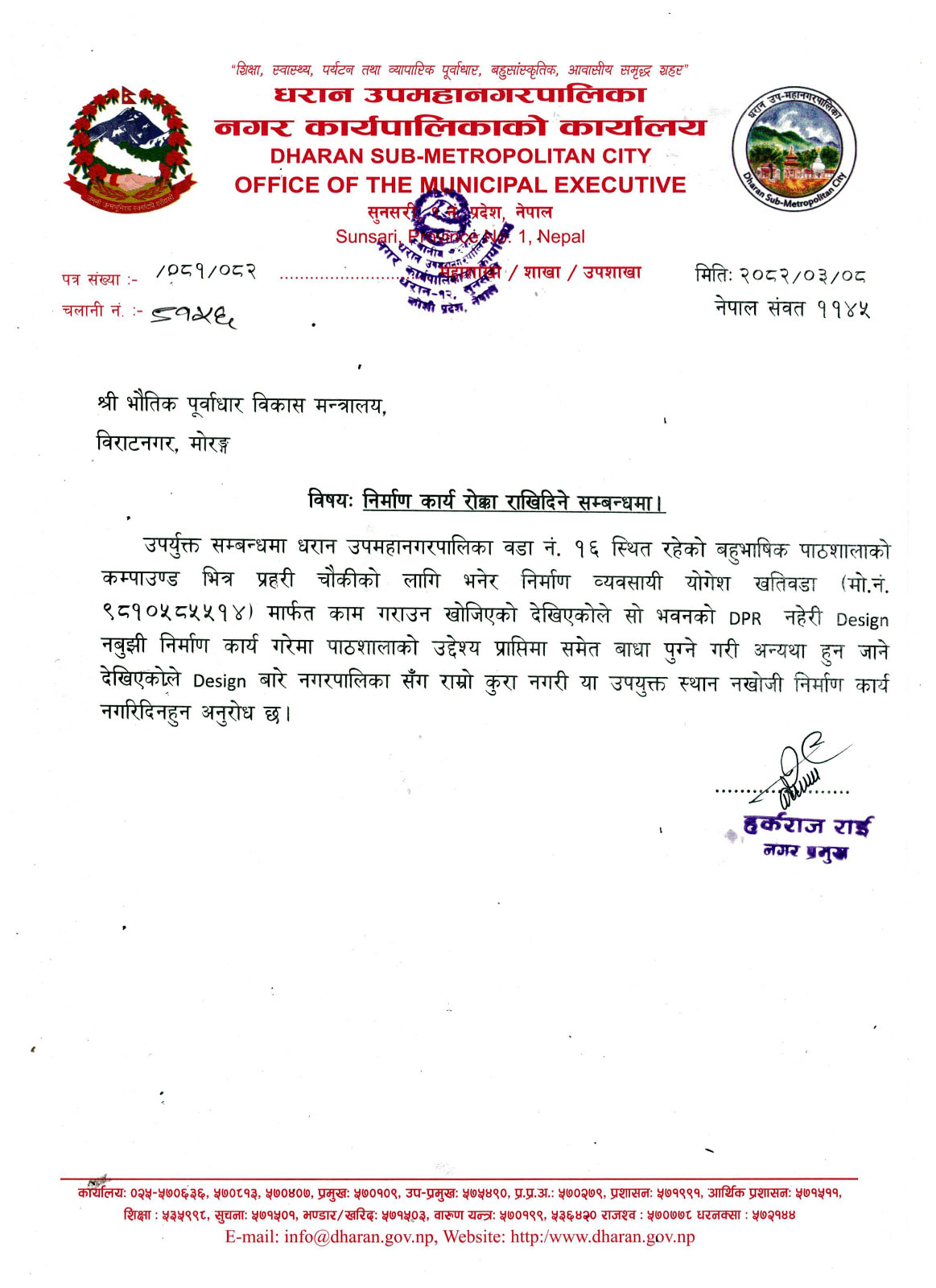 धरान । धरान उप महानगरपालिका मेयर हर्क साम्पाङले धरान १६ मा निर्माणाधीन प्रहरी चौकी निर्माणको काम रोक्न आदेश दिएका छन् ।