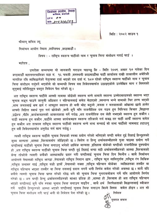 राष्ट्रिय स्वतन्त्र पार्टी (रास्वपा) को नामबाट ‘स्वतन्त्र’ र ‘घण्टी’ चुनाव चिन्ह हटाउन माग गर्दै निर्वाचन आयोगमा निवेदन परेको छ । सिन्धुलीका युवराज सफलले आज आयोगमा निवेदन दर्ता गराएका हुन् ।
