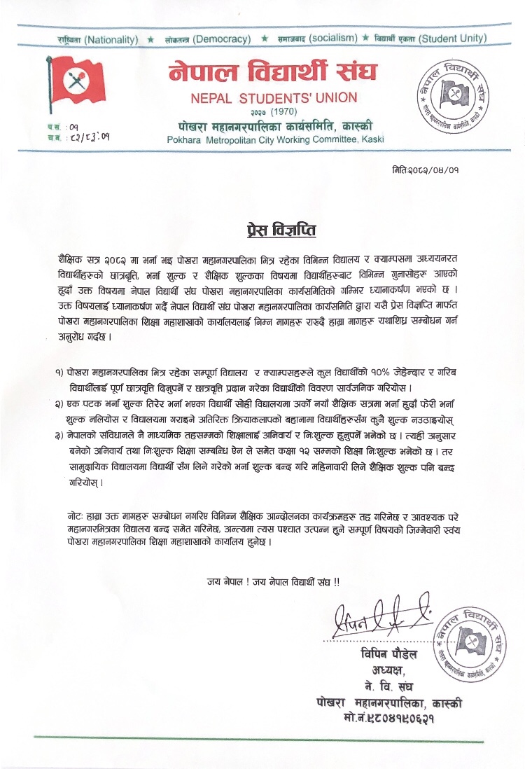 अध्यक्ष विपिन पौडेलले एक विज्ञप्ति जारी गर्दै शैक्षिक सत्र २०८२ का लागि विद्यार्थीहरूबाट आएका गुनासोहरूलाई सम्बोधन गर्न पोखरा महानगरपालिका शिक्षा महाशाखासँग माग गरेका हुन् ।