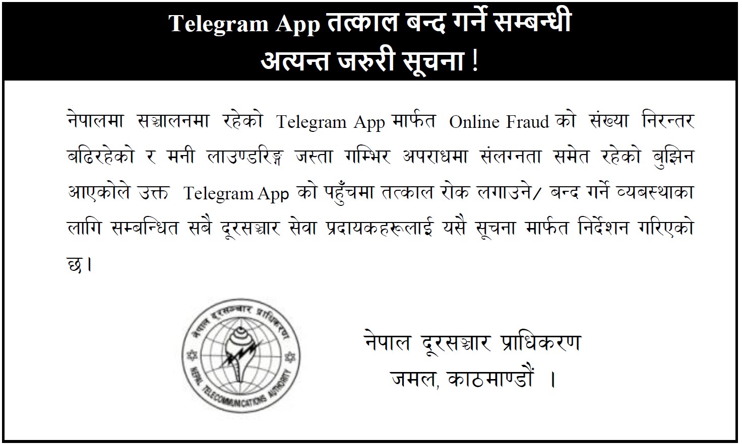 प्राधिकरणले आज एक सूचना जारी गर्दै टेलिग्राम एपकाे पहुँचमा तत्काल राेक लगाउने बन्द गर्ने व्यवस्थाका लागि सम्बन्धित सबै दूरसञ्चार सेवा प्रदायकहरुलाई निर्देशन दिएकाे छ ।