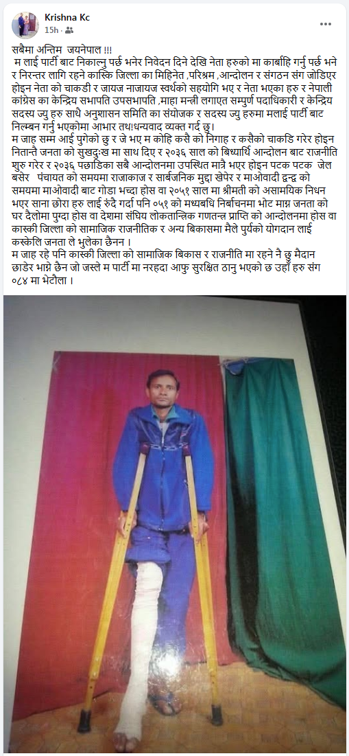 कृष्ण जी , अनुशासनको कारबाही समयमै गर्नु पर्ने थियो , ढिलो भयो , बेमौसमको बाजा भयो आदि इत्यादि जे भनिए पनि पार्टी भित्र गलत गर्नेलाई कारबाही गर्ने प्रक्रिया शुरु भएको छ । कारबाही ढिलो भयो भन्नु प्रक्रियागत कुरा भयो जसले भएका कमजोरी र अपराधहरुलाई छोप्न सक्दैन भन्ने कुरा तपाई राम्रै सग बुझ्नुहुन्छ । यसैले यो कारबाहीबाट ढाटेको – टालेको छोप्न सकिदैन भन्ने उखानको चरितार्थ भएको छ । पार्टीको हित बिपरित काम गरेको , अन्तरघात गरेको वा असहयोग आदि जे गरे पनि त्यसलाई लुकाउन सकिदो रहेनछ , आम मानिसले थाहा पाउदो रहेछ , आफ्नो अगाडि राम्रो राखे पनि वा तपाईं जस्तो महान मानिस भनेर जे जस्तो बिशेषण जोडे पनि भित्र भित्र समाजले खिस्सिट्युरी गर्दो रहेछ , गिज्याउदो रहेछ र पार्टीले पनि कारबाही गर्दो रहेछ भन्ने जुन सन्देश बाहिर आएको छ यसो हुनु भनेको पनि यो एउटा महान उपलब्धि हो । अब उप्रान्त जो कोहीले पनि पार्टीको बिरुद्द असहयोग गर्न वा अन्तरघात गर्नु भन्दा पहिला गम्भीर भएर सोच्नु पर्ने भएको छ । यसले आगामी दिनमा पार्टीको उज्ज्वल भविष्य प्रति संकेत गरेको छ ।यो उपलब्धि तपाईंको भोलिको राजनीतिक भविष्यका निम्ति पनि धेरै राम्रो र सुखद हुन सक्छ भनेर पनि बुझ्नु होला । यसै भएर यो राजनीतिक उचाईलाई बचाउनका लागि राजनीतिक रुपमै उजुरी गर्नु पर्ने परिस्थितिको सिर्जना भएको हो । उजुरी दर्ता भयो , जे जस्तो भए पनि कारबाही भयो । पार्टी संगठनका लागि यो महत्त्वपूर्ण सन्देश हो । जे भयो, थुप्रै सकारात्मक सन्देश दिएर एउटा पाटोको अन्त्य भयो । उजुरीको उद्देश्य पनि एक हद सम्म पुरा भयो । यो कुरा यहीँ श्रावण ६ गते नेपाली काङ्ग्रेस , गण्डकी प्रदेश कार्यसमितिले आयोजना गरेको बी पी स्मृति दिवसका दिन पनि मैले तपाईकै उपस्तिथिमा सार्वजनिकरुपमा राखिसकेको पनि छु । त्यो मेरो अभिव्यक्तिलाई पुनः एक पटक स्मरण गर्नुहोला ।