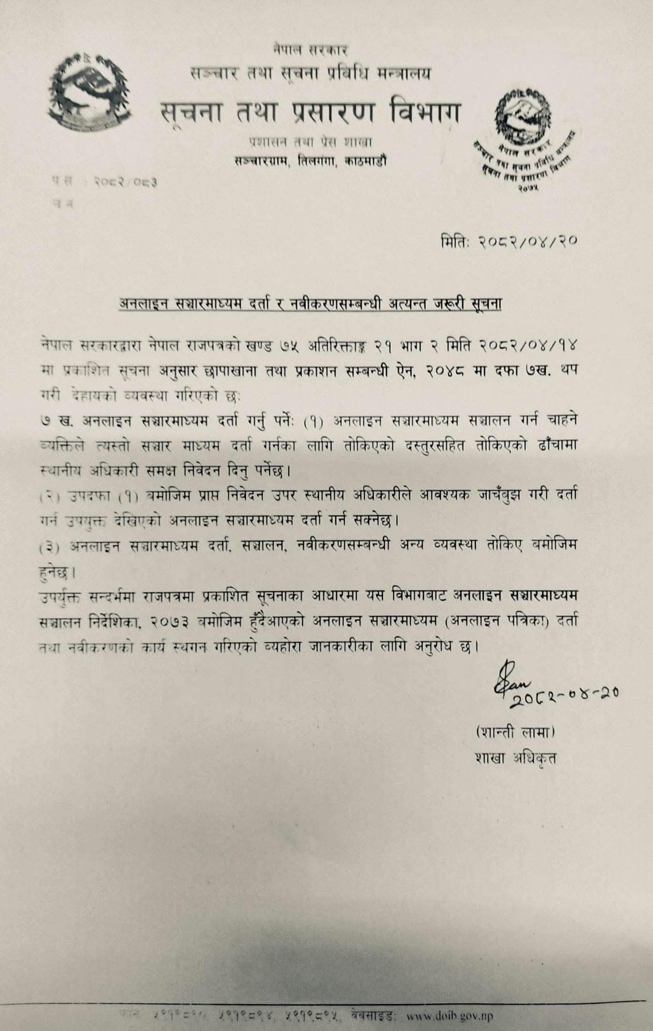 विभागले यसअघि लागू रहेको अनलाइन सञ्चारमाध्यम सञ्चालन निर्देशिका, २०७३ अनुसार सञ्चालन हुँदै आएको अनलाइन सञ्चारमाध्यम दर्ता तथा नवीकरण प्रक्रिया नयाँ कानुनी संरचनासँग समन्वय आवश्यक भएकाले हाललाई स्थगित गरिएको उल्लेख छ ।