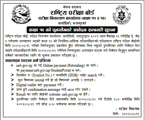 गत वैशाख २१ गतेदेखि जेठ २ गतेसम्म सञ्चालित कक्षा १२ को नियमित तथा आंशिक परीक्षाको नतिजा साउन १९ गते प्रकाशित भएको थियो।
