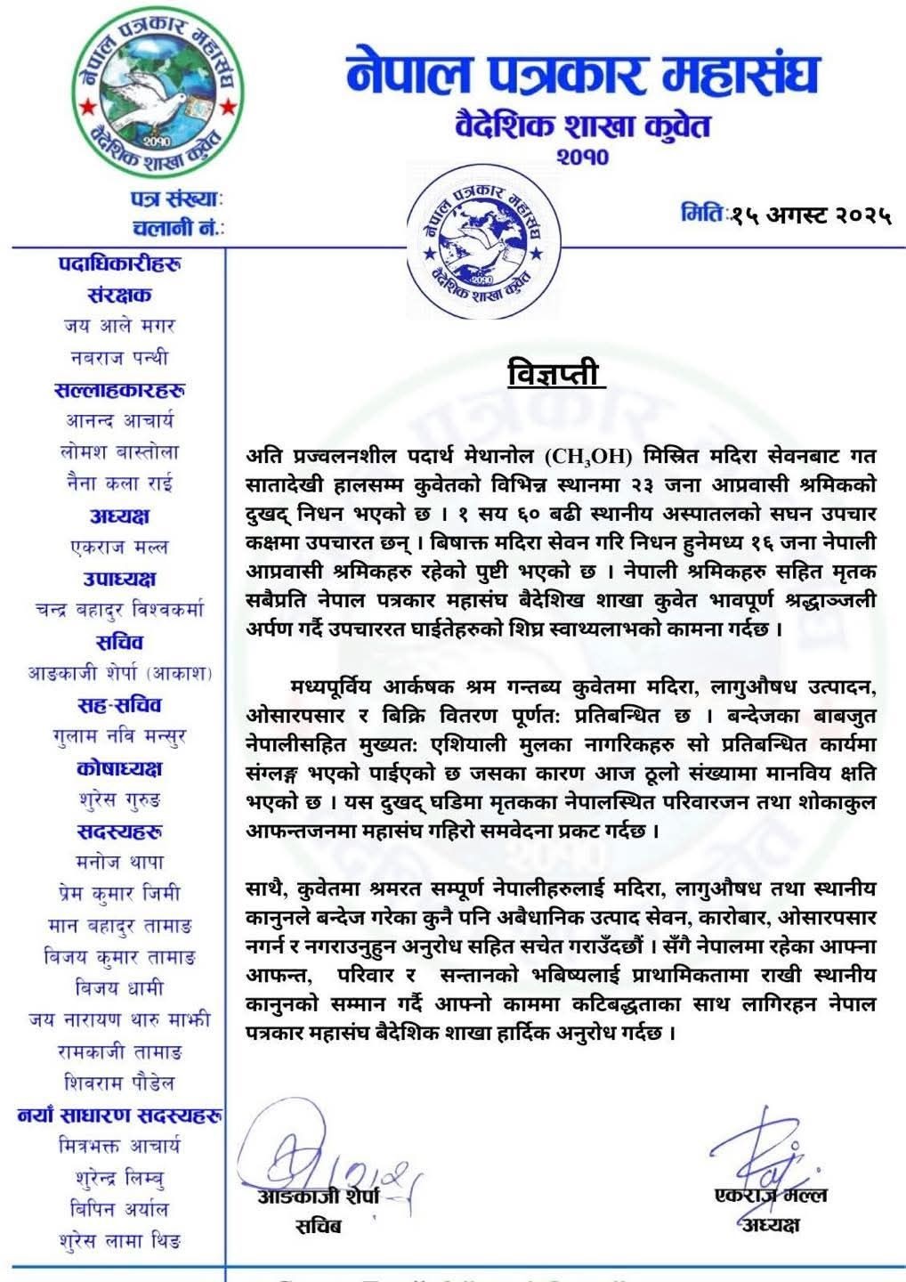 कुवेतमा ज्यान गुमाउने नेपालीको संख्या १६ पुगेको छ। विषाक्त मदिरा सेवनका कारण उनीहरूको मृत्यु भएको आशंका गरिएको छ।