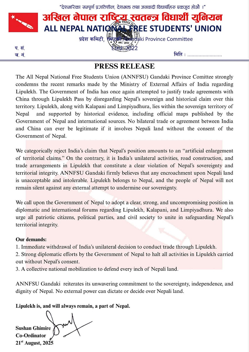 अनेरास्ववियु, गण्डकीका संयोजक सुशन घिमिरेले आज एक विज्ञप्ति जारी गर्दै नेपालको अविभाज्य र सार्वभौम क्षेत्र लिपुलेकमार्फत् व्यापार गर्न भारत र चीन बीच भएको सम्झौताप्रति कडा विरोध र निन्दा व्यक्त गरेका हुन् ।