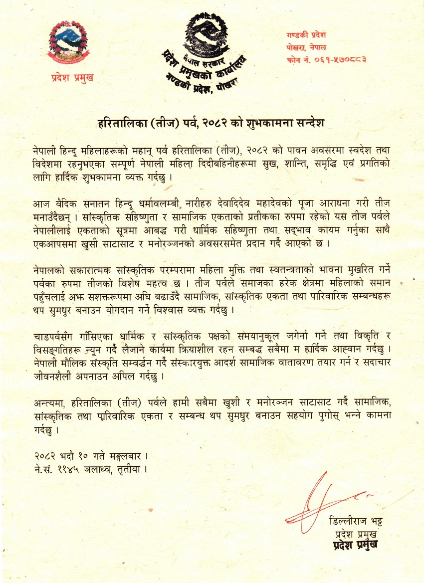 पोखरा । गण्डकी प्रदेशका प्रमुख डिल्लीराज भट्टले नेपाली हिन्दू महिलाहरूको महान् पर्व हरितालिका (तीज) महिला मुक्ति तथा स्वतन्त्रताको भावना मुखरित गर्ने पर्व भएकाले छुट्टै महत्व बोकेको बताएका छन् ।