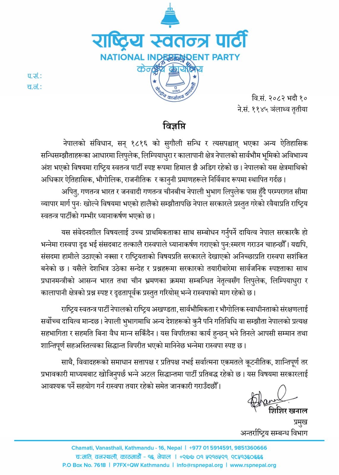 रास्वपाले लिपुलेक, लिम्पियाधुरा र कालापानी क्षेत्र नेपालको अविभाज्य हिस्सा भएको भन्दै यसको रक्षाका लागि सरकारलाई दृढ कदम चाल्न आह्वान गरेको छ। नेपालको संविधान, सुगौली सन्धि (१८१६) लगायत ऐतिहासिक सन्धिहरूले यी क्षेत्रहरू नेपालको सार्वभौम भूमि भएको स्पष्ट पारेकाे छ।